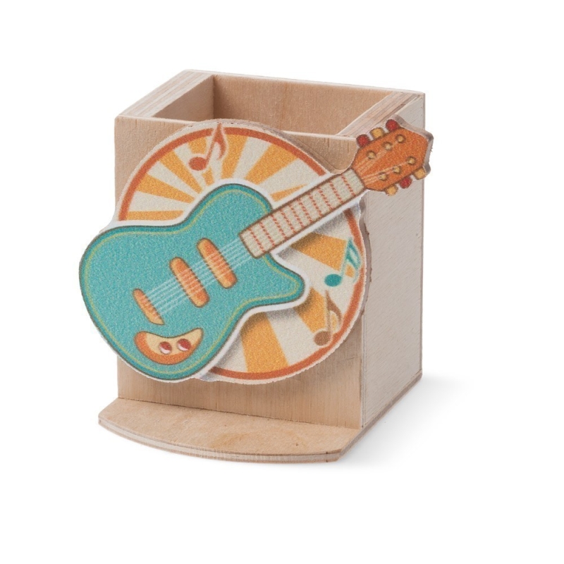 Ξύλινη μολυβοθήκη σε natural χρώμα. Διακοσμημένη με ξύλινη παράσταση κιθάρα.