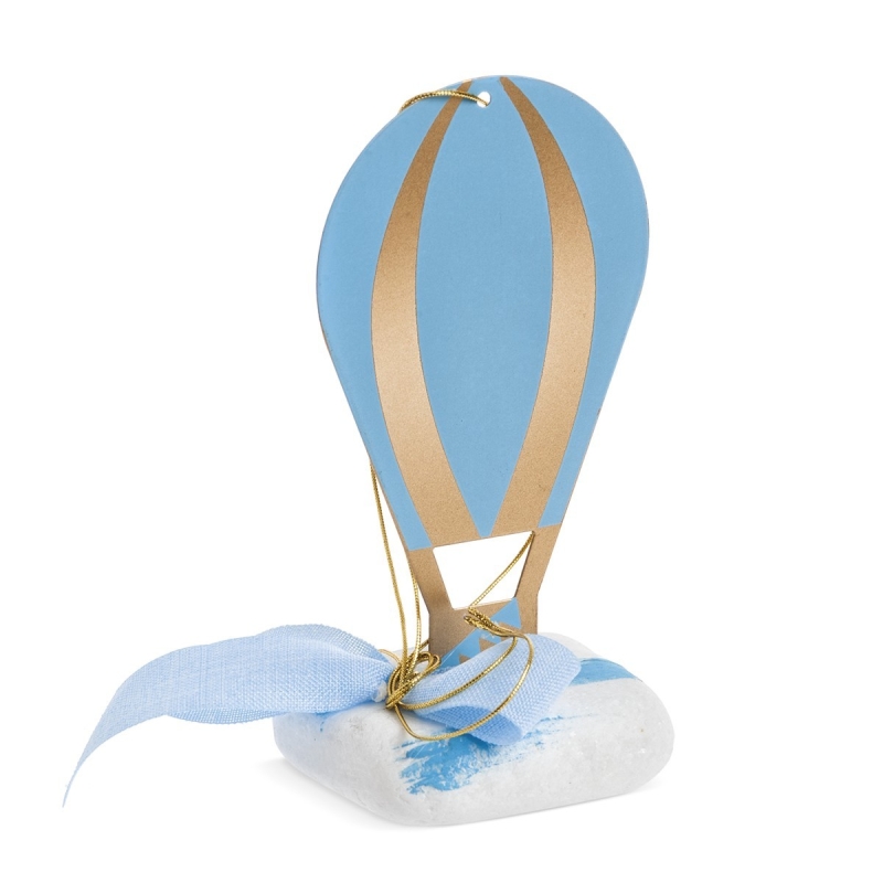 Χειροποίητο διακοσμητικό βότσαλο σε λευκό χρώμα και σβησίματα σιέλ. Είναι στολισμένο με μεταλλικό αερόστατο σε σιέλ και χρυσές αποχρώσεις και λινή κορδέλα.