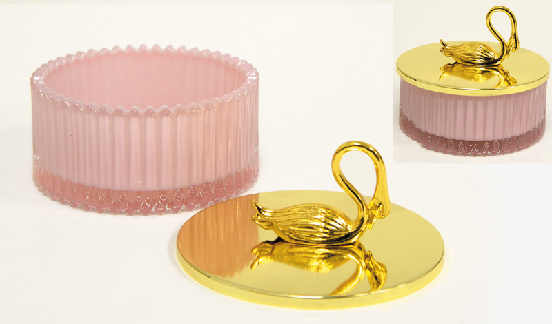 Φοντανιέρα Γυάλινη με σχέδιο κύκνος σε ροζ απόχρωση με χρυσό καπάκι.  Διαστάσεις 10.5cm x 8cm.