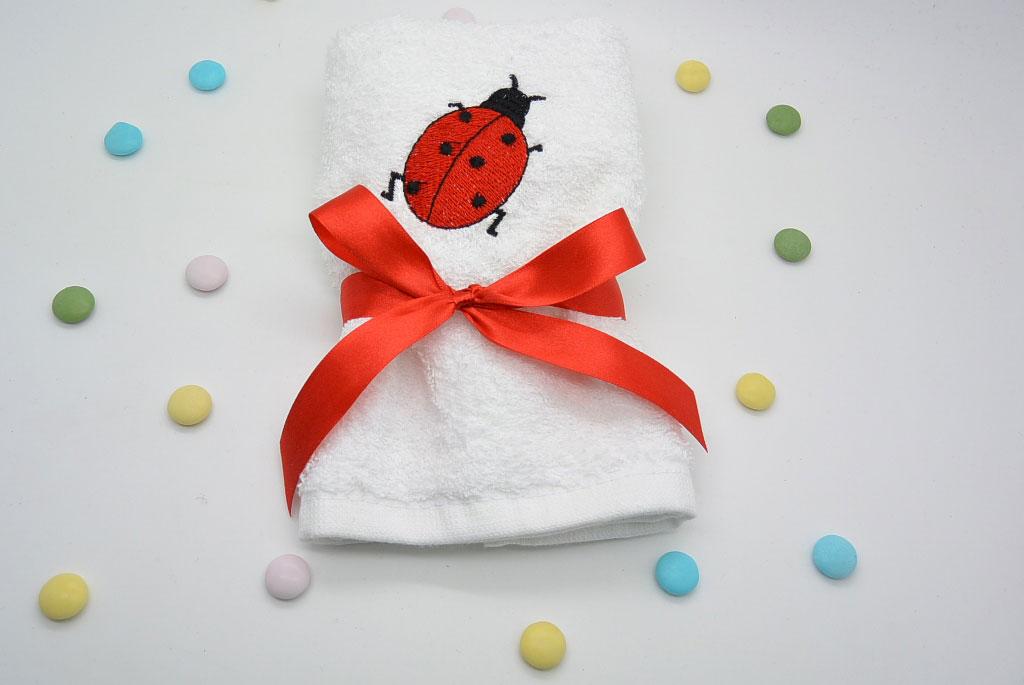 Μπομπονιέρα Βάπτισης πετσέτα με κεντημένο θέμα πασχαλίτσα. Η τιμή αφορά δεμένη μπομπονιέρα με 5 κουφέτα αμυγδάλου ή 9 κουφετάκια smarties. Διάσταση πετσέτας 30 χ 50 εκ. Με έξτρα χρέωση 0.30 μπορεί να κεντηθεί και το όνομα του παιδιού.