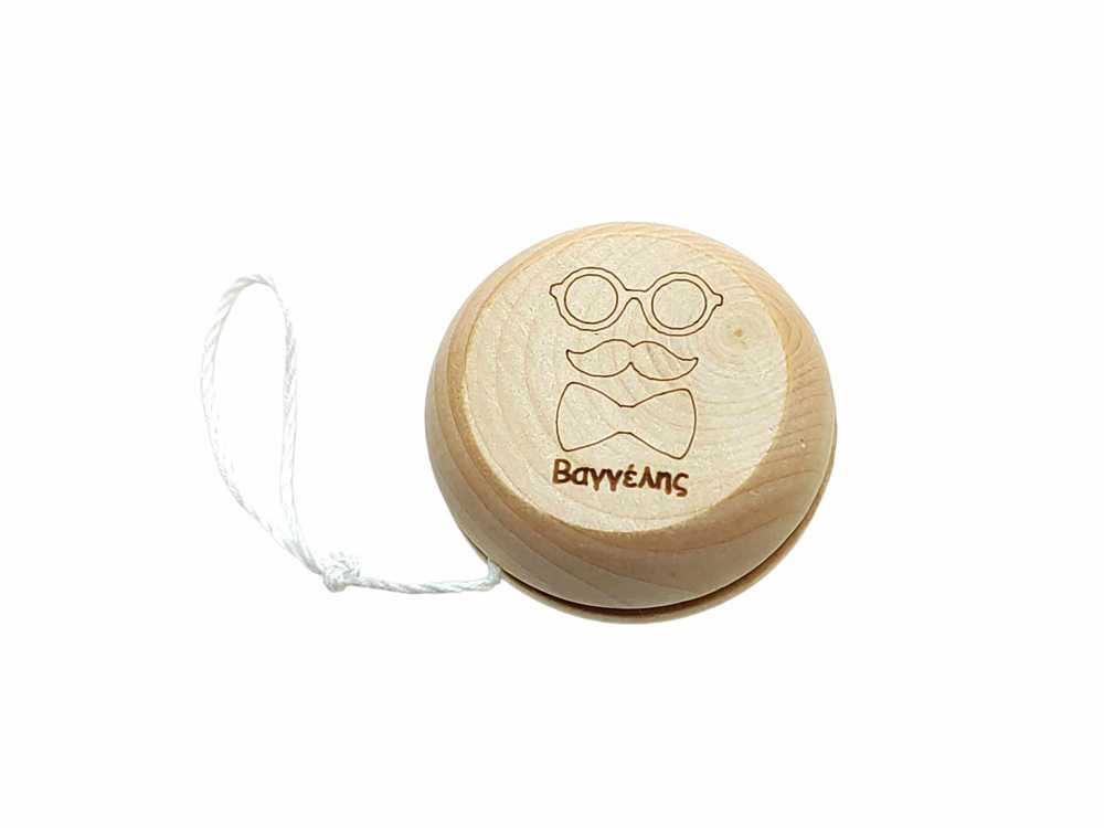 Ξύλινο ΓΙΟ ΓΙΟ μικρός κύριος με το όνομα του παιδιού σας. Μπορεί να γίνει σε ότι σχέδιο ή θέμα θέλετε. Διάμετρος 5,5 εκ.