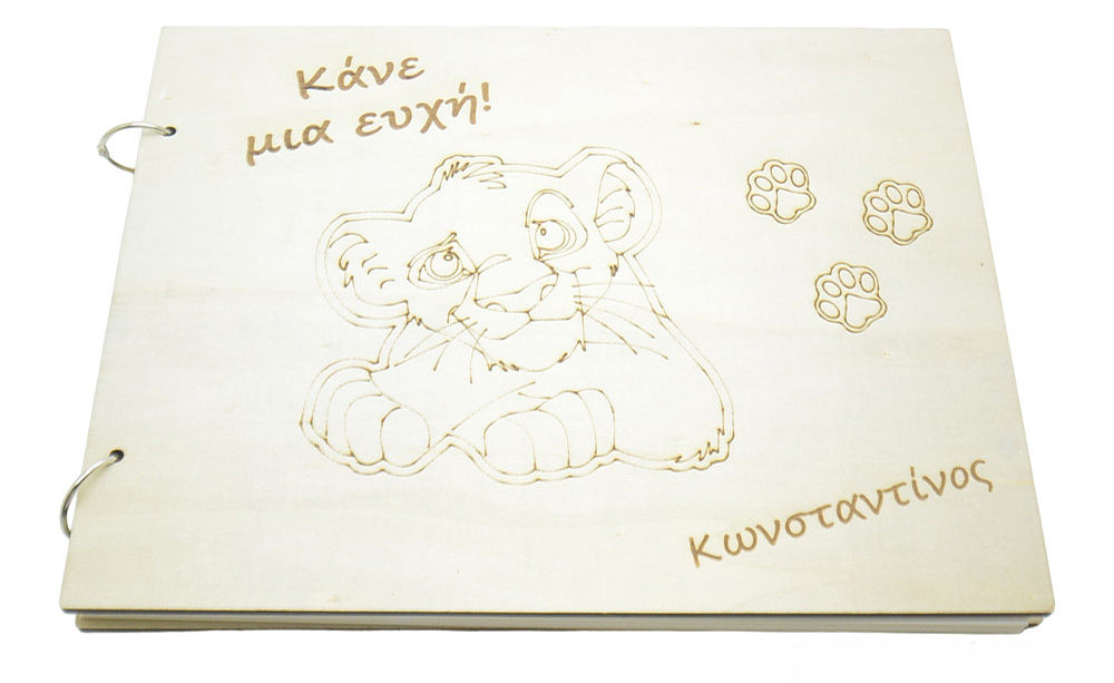 Βιβλίο ευχών βάπτισης με θέμα λιοντάρι lion king με ξύλινο εξώφυλλο χαραγμένο με laser. Η διάσταση του είναι 28.5 x 22 εκ και περιέχει 30 σελίδες.