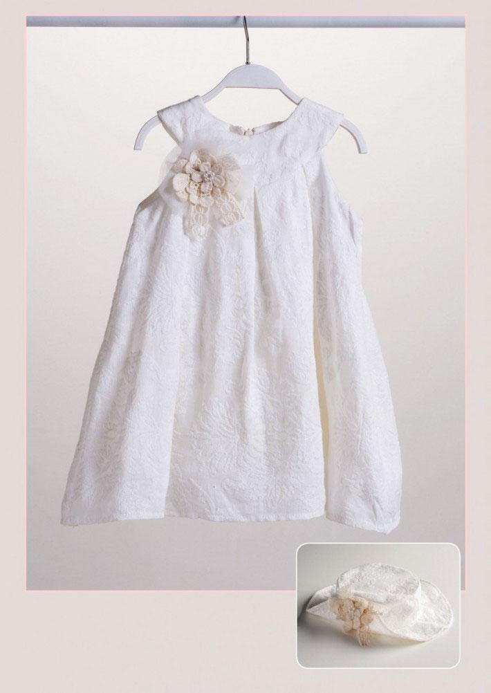 Φόρεμα λινό λευκό μπροκάρ με ανάγλυφα λουλούδια. Ασορτί καπελάκι με μπεζ διακόσμηση.