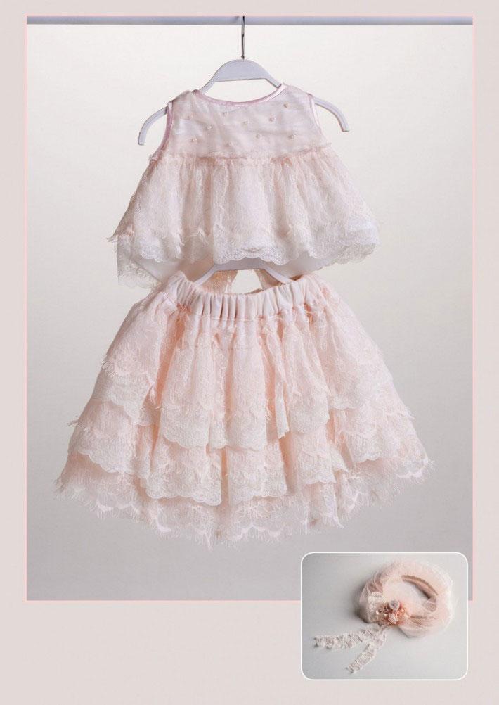 Φούστα tutu από τριπλό βολάν με σειρές από δαντέλα. Μπούστο από δαντέλα με πέρλες. Συνδυάζεται με κορδελίτσα για τα μαλλιά με λουλούδια και δαντέλα.