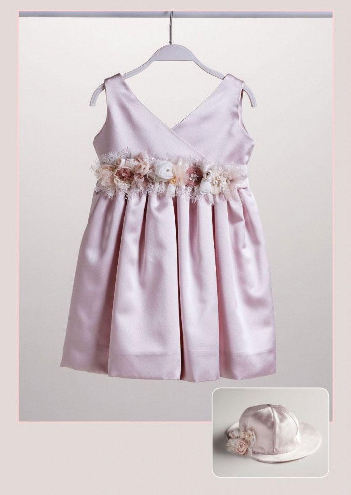 Φόρεμα σατέν σε παστέλ αποχρώσεις με ζώνη από χειροποίητα λουλούδια και πέρλες. Συνδυάζεται με ασορτί καπέλο