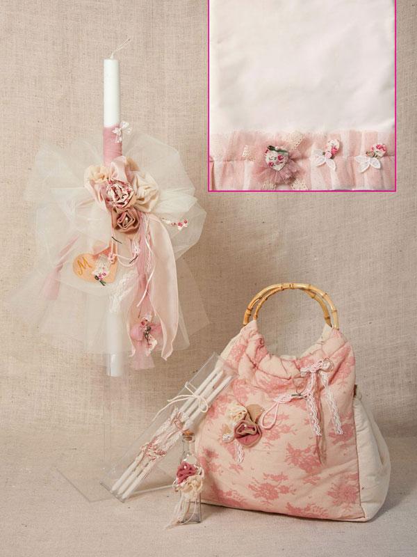 Σετ Βάπτισης καρδιές και τριαντάφυλλα σε απόχρωση σάπιο μήλο. Το σετ περιλαμβάνει τσάντα χειροποίητη, σετ λαδόπανα, λαμπάδα και σετ λαδικού όλα στολισμένα στο ίδιο θέμα.