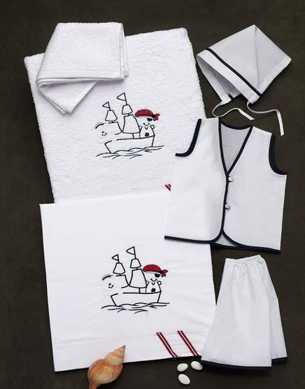 Λαδόπανα ελληνικής κατασκευής άριστης ποιότητας σε απόχρωση λευκό - navy με θέμα πειρατής. Το σετ περιλαμβάνει πετσέτα μικρή και μεγάλη, σεντονάκι και σετ εσώρουχα.