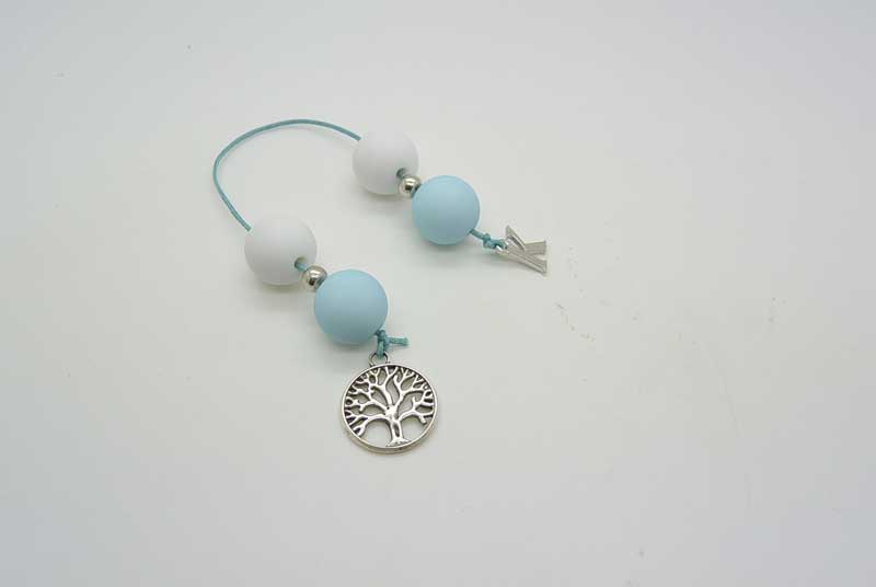 Μπεγλέρι Βάπτισης δέντρο της ζωής σε σιέλ - ασημί απόχρωση με επιπλέον το μονόγραμμα του μωρού. Το ίδιο μπορεί να γίνει και σε ροζ. Η τιμή αφορά μόνο το μπεγλέρι, με επιπλέον χρέωση μπορεί να γίνει ολοκληρωμένη μπομπονιέρα. Η χάντρα έχει διάμετρο 1.6 εκ.