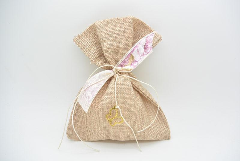 Μπομπονιέρα Βάπτισης πουγκί με διακοσμητικό πεταλούδα. Η τιμή αφορά δεμένη μπομπονιέρα με 5 κουφέτα αμυγδάλου ή 9 κουφετάκια smarties. Διάσταση πουγκί 14 x 18 εκ.