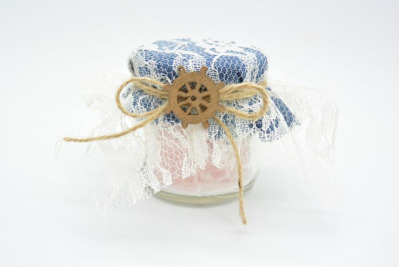 Βαζάκια με γλυκό για κέρασμα γάμου | Βαζάκι με λουκούμια με εκρού - μπλε δαντέλα (853416)