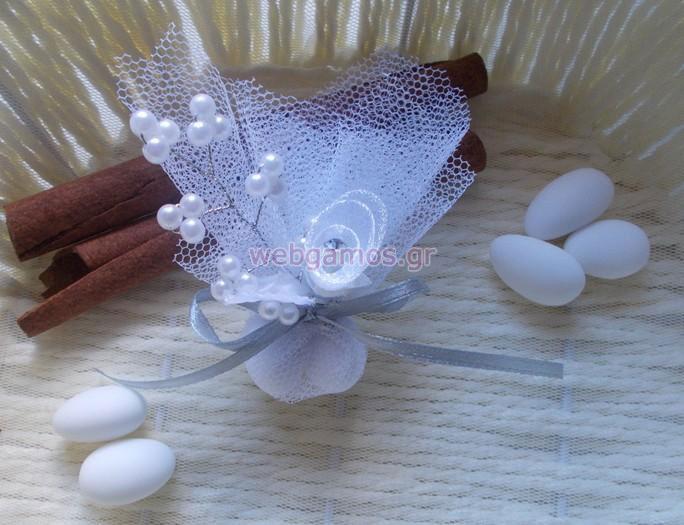 Κέρασμα για γάμο ή αρραβώνα σε αποχρώσεις του λευκού με διακοσμητικό λουλούδι και πέρλα. Το παρόν προιόν μπορεί να γίνει σε διάφορες αποχρώσεις.