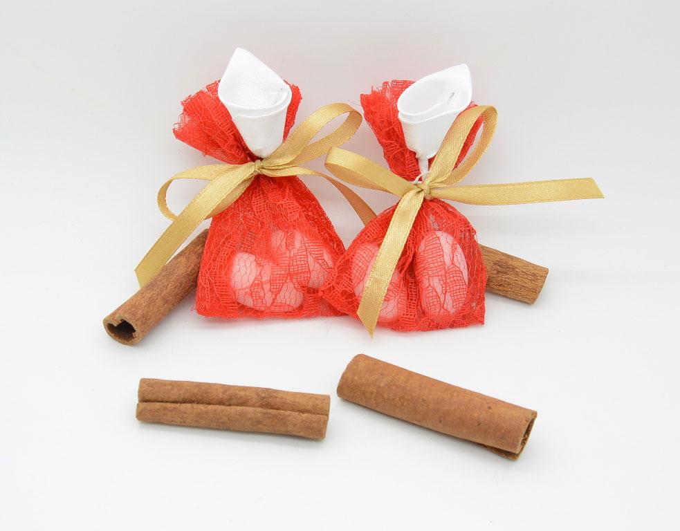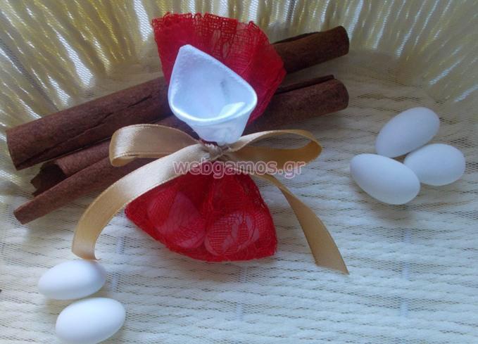Κέρασμα για γάμο ή αρραβώνα με πουγκάκι δαντέλα σε αποχρώσεις του κόκκινου και διακοσμητικό κρίνο. Το παρόν προιόν μπορεί να γίνει σε διάφορες αποχρώσεις.