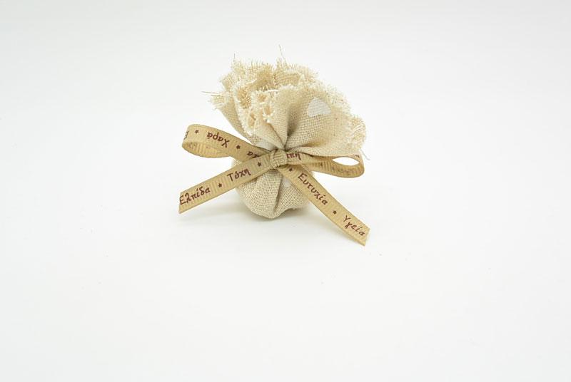 Κέρασμα για γάμο ή αρραβώνα σε φυσικό της άμμου τυπωμένο με καρδιές και ιδιαίτερη κορδέλα. Περιλαμβάνει 2 κουφέτα αμυγδάλου.