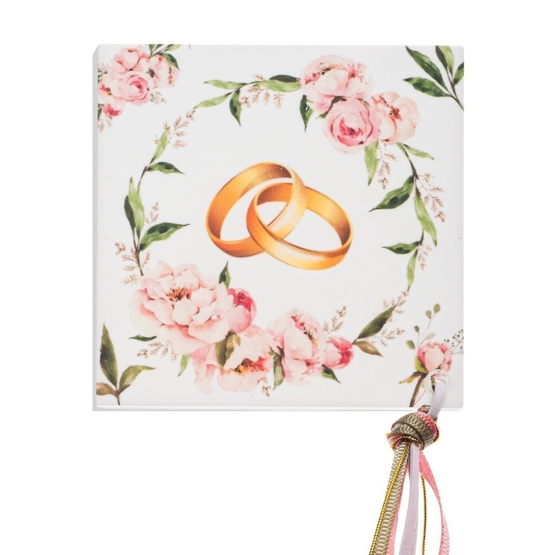 Σουβέρ σε τετράγωνο σχήμα με print plexiglass παράσταση σε λευκό χρώμα. Η παράσταση απεικονίζει τις χρυσές βέρες μέσα σε ένα στεφανάκι από ροζ παιώνια.
