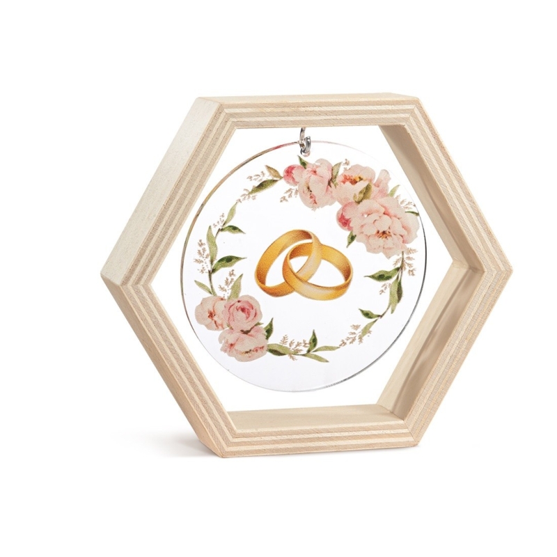 Ξύλινο διακοσμητικό σε σχήμα πολύγωνο.Το καδράκι είναι διακοσμημένο με στρογγυλή print plexiglass παράσταση σε διάφανο χρώμα.Η παράσταση απεικονίζει τις βέρες μέσα σε ένα συννεφάκι από ροζ παιώνια .