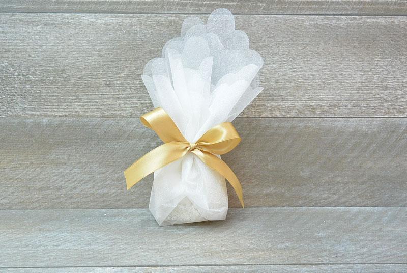 Μπομπονιέρα Γάμου απλή κλασσική. Περιλαμβάνει τούλι οργάντζα 36 x 36 cm σε εκρού απόχρωση και κορδέλα χρώματος της επιλογής σας. Η τιμή αφορά δεμένη μπομπονιέρα με 5 κουφέτα αμυγδάλου.