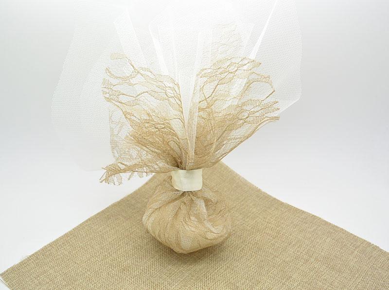 Μπομπονιέρα Γάμου δαντέλα σε φυσική απόχρωση και τούλι εκρού.
