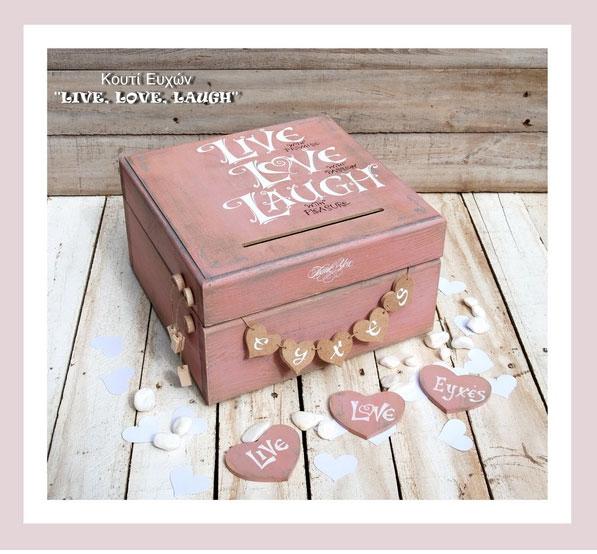Ξύλινο Κουτί Ευχών γάμου χειροποίητο live, love and laugh. Το κουτί είναι απο μασίφ ξύλο και έχει διαστάσεις 30 x 30 x 18 cm. Οι ευχές μπορούν να γραφτούν σε χαρτονάκια απλά ή σε ξύλινες καρδιές με ανεξίτηλο στυλό. Υπάρχει η δυνατότητα να επιλέξετε χρώμα καρδιάς. Διάσταση καρδιάς 8 x 8,6 cm.