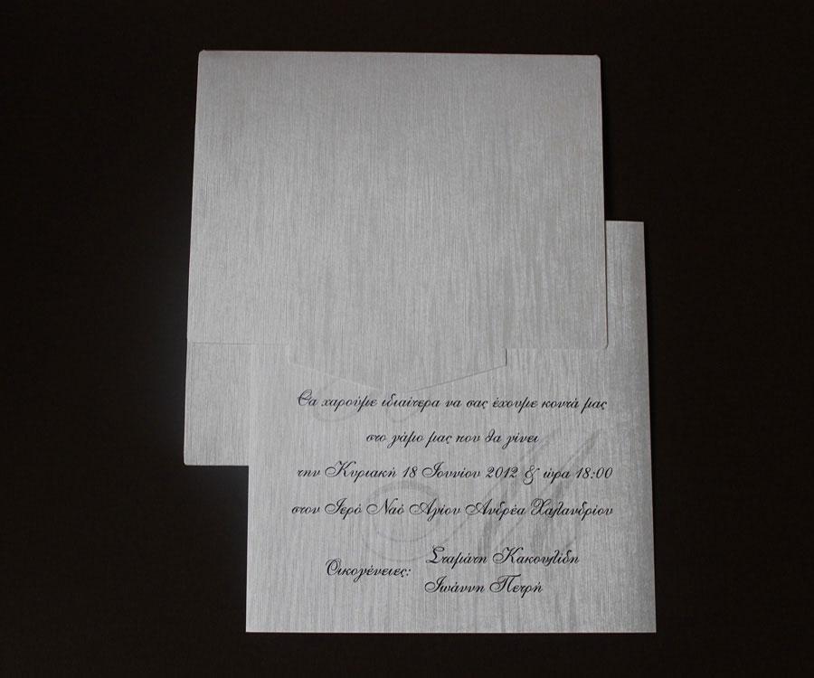 Προσκλητήριο Γάμου τετράγωνο κατασκευασμένο από μεταλλικής υφής ασημί σκληρό χαρτί fedrigoni. Οι διαστάσεις της πρόσκλησης είναι 17 x 17 εκ. Ο εξωτερικός φάκελλος έχει το ίδιο βάρος χαρτιού όπως και η εσωτερική κάρτα. Μια κομψή διαχρονική επιλογή απο άριστης ποιότητας χαρτί. Η τιμή αφορά μόνο το προσκλητήριο. Η εκτύπωση είναι 35 ευρώ ανεξαρτήτου ποσότητας. Με επιπλέον χρέωση μπορούν να γίνουν καρτελάκια δεξίωσης.