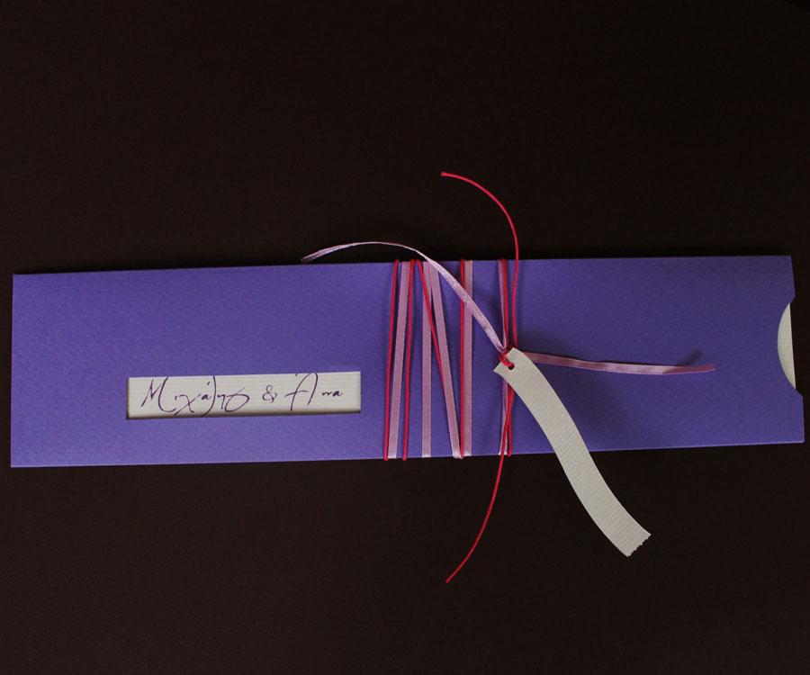 Προσκλητήριο Γάμου στενόμακρο κατασκευασμένο από μωβ χρώματος σκληρό χαρτί που συνδιάζεται υπέροχα με κορδέλες και δένει τα ονόματα των καλεσμένων με κυματοειδές καρτελάκι. Οι διαστάσεις της πρόσκλησεις είναι 7,5 x 34 εκ. Ο εξωτερικός φάκελος έχει παράθυρο ώστε να φένονται τα ονόματα των μελλόνυμφων. Η τιμή αφορά μόνο το προσκλητήριο. Η εκτύπωση είναι 35 ευρώ ανεξαρτήτου ποσότητας. Με επιπλέον χρέωση μπορούν να γίνουν καρτελάκια δεξίωσης.