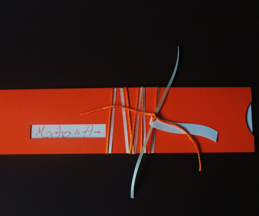 Προσκλητήριο στενόμακρο κατασκευασμένο από πορτοκαλί χρώματος σκληρό χαρτί που συνδυάζεται υπέροχα με κορδέλες και δένει τα ονόματα των καλεσμένων με κυματοειδές εκρού καρτελάκι. Είναι μια κομψή και μοντέρνα πρόταση για το γάμο σας. Οι διαστάσεις της πρόσκλησης είναι 7,5 χ 34 εκ. Ο εξωτερικός φάκελος έχει παράθυρο ώστε να φαίνονται τα ονόματα των μελλόνυμφων αφού η εκτύπωση γίνεται στην εσωτερική κάρτα. Μια πραγματικά μοντέρνα και πολύ ευχάριστη πρόταση.