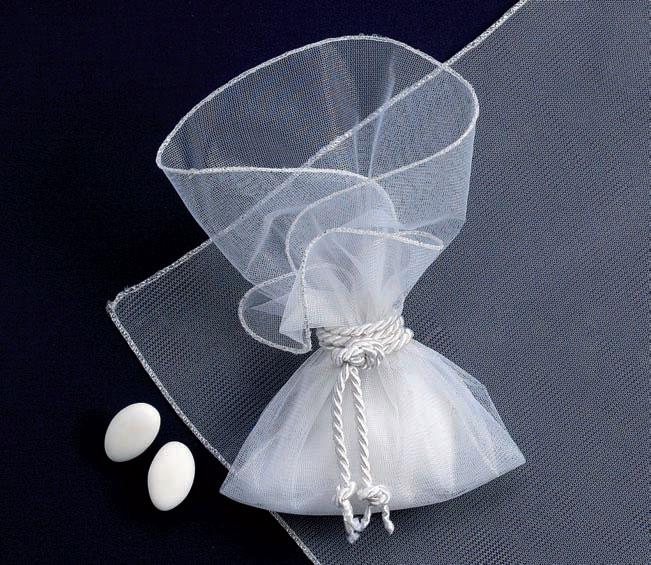 Οικονομική Μπομπονιέρα γάμου. Αποτελείται από ύφασμα με μεσινέζα έχει διαστάσεις 33 x 33 cm. Στην τιμή περιλαμβάνεται το δέσιμο της μπομπονιέρας και 5 κουφέτα.
