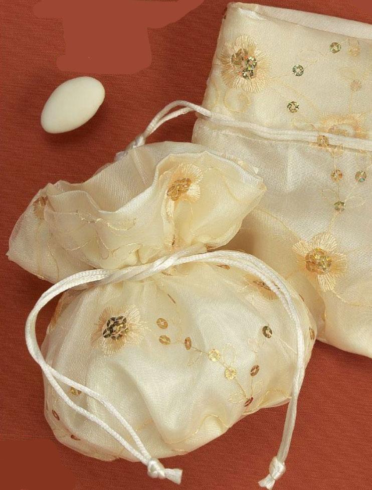 Μπομπονιέρα Γάμου πουγκί σε 2 αποχρώσεις. Στην τιμή περιλαμβάνονται το δέσιμο της μπομπονιέρας με 5 κουφέτα αμυγδάλου. Διαστάσεις 15 cm.