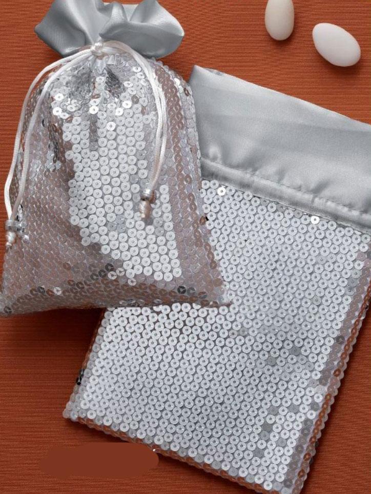 Μπομπονιέρα Γάμου πουγκί σε ασημί απόχρωση. Στην τιμή περιλαμβάνονται το δέσιμο της μπομπονιέρας με 5 κουφέτα αμυγδάλου.