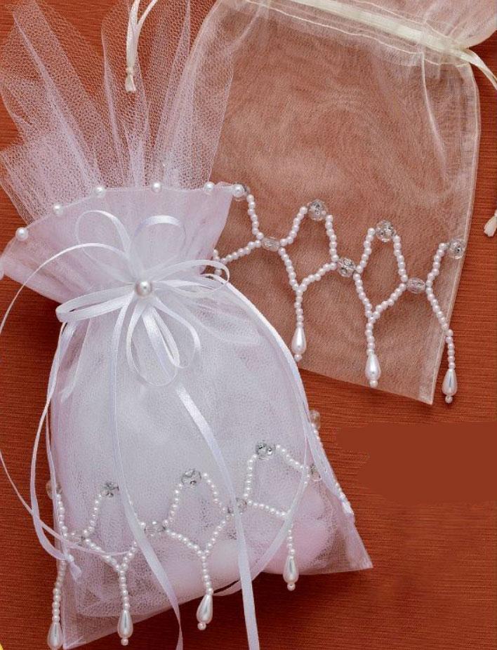 Μπομπονιέρα Γάμου πουγκί σε 2 αποχρώσεις με πέρλες. Στην τιμή περιλαμβάνονται το δέσιμο της μπομπονιέρας με 5 κουφέτα αμυγδάλου.