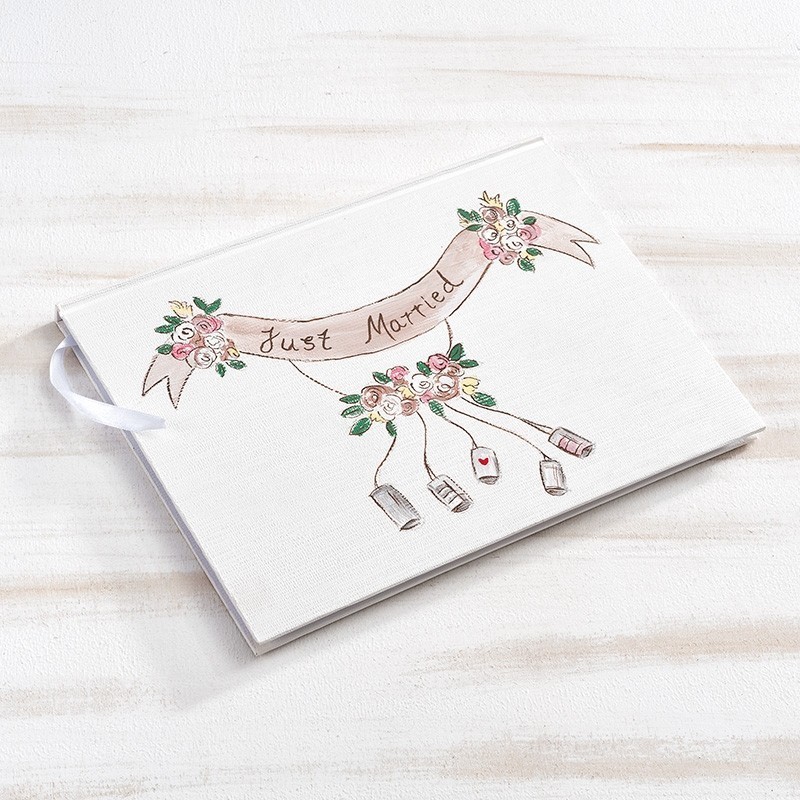 Βιβλίο ευχών λευκό με εξώφυλλο από χοντρό χαρτόνι, ζωγραφισμένο στο χέρι με πινακίδα Just married και λουλούδια.
