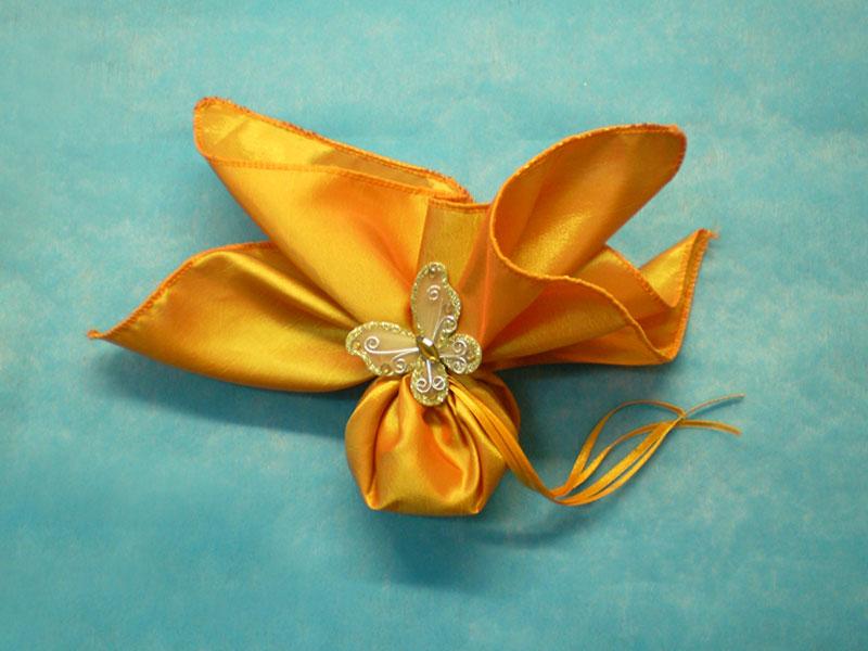 Μπομπονιέρα Γάμου με  σχέδιο πεταλούδα. Στην τιμή περιλαμβάνονται ενα υφάσματα σατέν ταφτά πολυτελείας 36 x 36 cm, μια πεταλούδα και 5 κουφέτα.