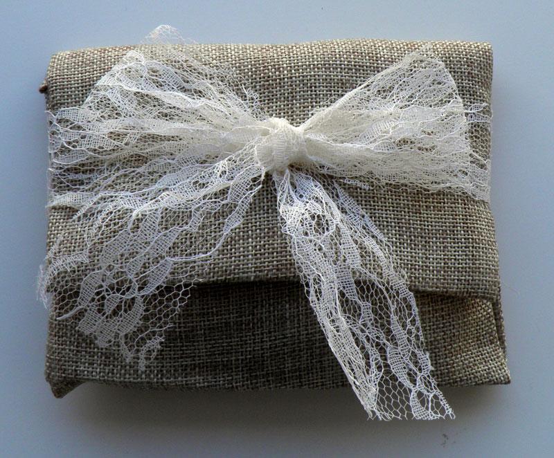 Μπομπονιέρα Γάμου φάκελος καμβάς με δέσιμο δαντέλας . Η τιμή αφορά δεμένη μπομπονιέρα με 5 κουφέτα αμυγδάλου. Διάσταση φακέλου 15 x 14cm.