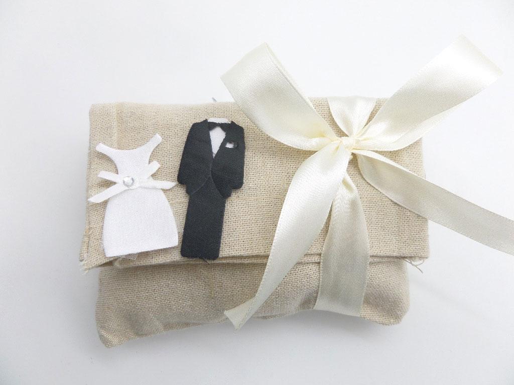 Μπομπονιέρα Γάμου πουγκί φυσικό της άμμου φάκελος με διακοσμητικό γαμπρός και νύφη. Η τιμή αφορά δεμένη μπομπονιέρα με 5 κουφέτα αμυγδάλου. Διάσταση 14cm x 18cm.