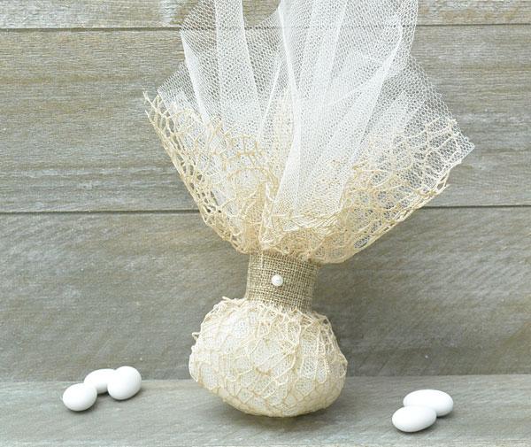 Μπομπονιέρα Γάμου με εκρού τούλι, δίχτυ σε απόχρωση φυσική και πέρλα. Η τιμή αφορά δεμένη μπομπονιέρα με 5 κουφέτα αμυγδάλου. Διάσταση τούλι 40 x 45 εκ. Οι αποχρώσεις μπορούν να γίνουν ανάλογα με την προτίμηση σας.