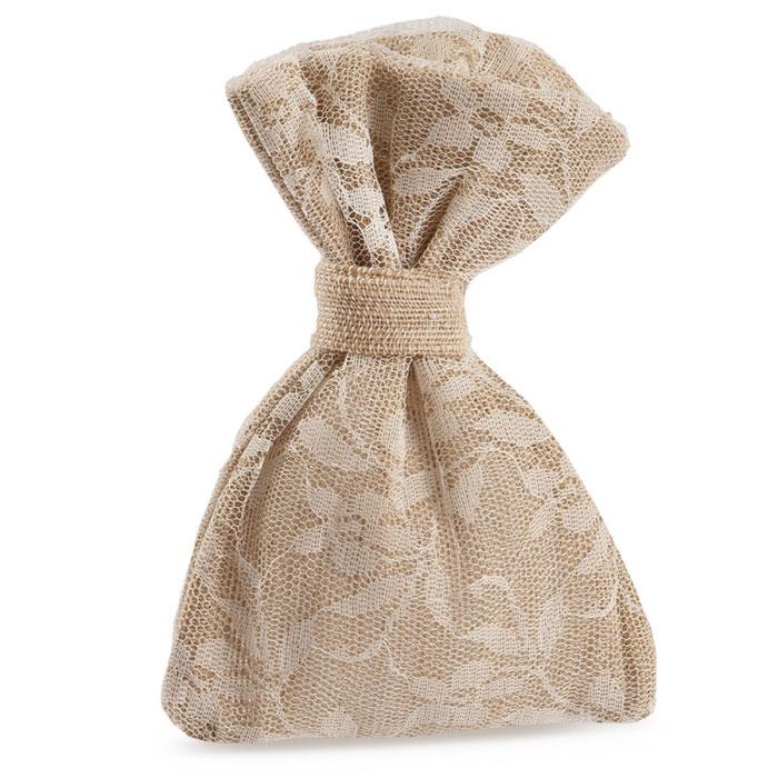Μπομπονιέρα Γάμου πουγκί λινό με δαντέλα με διάσταση 14 x 20 εκ. Η τιμή αφορά δεμένη μπομπονιέρα με 5 κουφέτα αμυγδάλου.