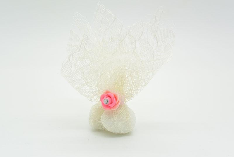Κέρασμα για γάμο ή αρραβώνα με δαντέλα σε απόχρωση εκρού και διακοσμητικό τριανταφυλλάκι ροζ. Το παρόν προιόν μπορεί να γίνει σε διάφορες αποχρώσεις.
