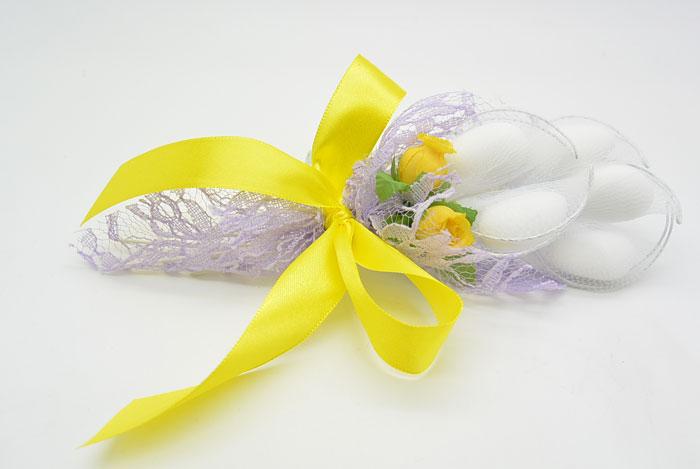 Μπομπονιέρα Γάμου μπουκετάκι με λούλουδια απο γάζα σε κίτρινο λιλά. Η τιμή αφορά δεμένη μπομπονιέρα με 5 κουφέτα αμυγδάλου. Τα χρώματα μπορούν να γίνουν σύμφωνα με την προτίμηση σας.
