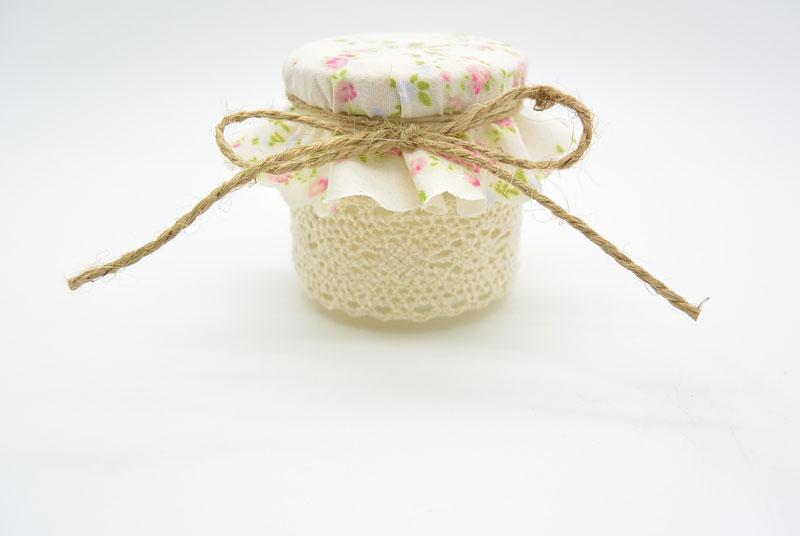 Μπομπονιέρα Γάμου βαζάκι διακοσμημένο με βαμβακερή δαντέλα και φλοράλ πανάκι. Η τιμή αφορά δεμένη μπομπονιέρα με 5 κουφέτα αμυγδάλου.
