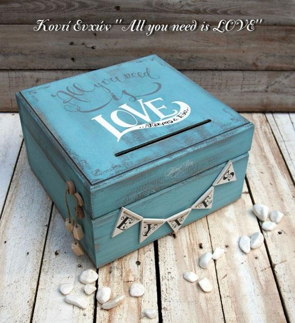 Ξύλινο Κουτί Ευχών γάμου χειροποίητο all you need is love. Το κουτί είναι απο μασίφ ξύλο και έχει διαστάσεις 30 x 30 x 18 cm. Οι ευχές μπορούν να γραφτούν σε χαρτονάκια απλά ή σε ξύλινες καρδιές με ανεξίτηλο στυλό. Υπάρχει η δυνατότητα να επιλέξετε χρώμα καρδιάς. Διάσταση καρδιάς 8 x 8,6 cm.