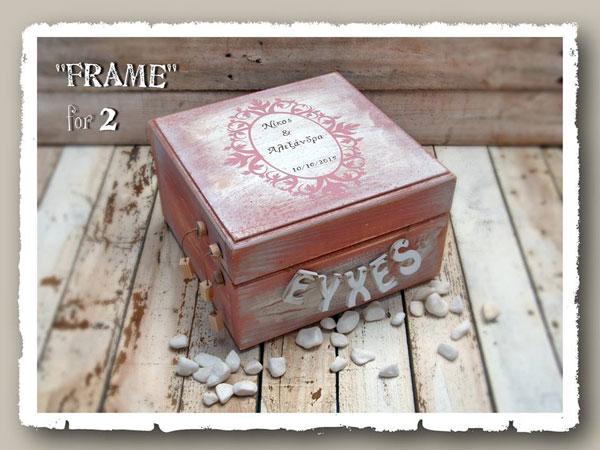 Ξύλινο Κουτί Ευχών γάμου χειροποίητο με τα ονόματα του ζευγαριού πάνω στο καπάκι. Το κουτί είναι απο μασίφ ξύλο και έχει διαστάσεις 30 x 30 x 18 cm. Οι ευχές μπορούν να γραφτούν σε χαρτονάκια απλά ή σε ξύλινες καρδιές με ανεξίτηλο στυλό. Υπάρχει η δυνατότητα να επιλέξετε χρώμα καρδιάς. Διάσταση καρδιάς 8 x 8,6 cm.