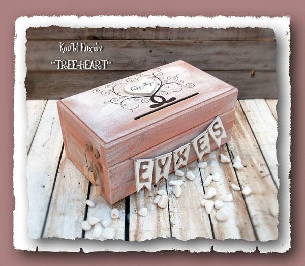 Ξύλινο Κουτί Ευχών γάμου χειροποίητο καρδιά με δέντρο. Το κουτί είναι απο μασίφ ξύλο και έχει διαστάσεις 40 x 23 x 18 cm. Οι ευχές μπορούν να γραφτούν σε χαρτονάκια απλά ή σε ξύλινες καρδιές με ανεξίτηλο στυλό. Υπάρχει η δυνατότητα να επιλέξετε χρώμα καρδιάς. Διάσταση καρδιάς 8 x 8,6 cm.