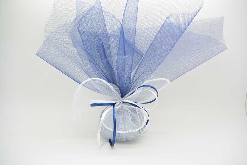 Οικονομική Μπομπονιέρα γάμου σε απόχρωση λευκό - μπλε navy. Αποτελείται από οργάντζα με μεσινέζα και έχει διαστάσεις 30 cm και ένα τούλι 45 x 45 cm. Στην τιμή περιλαμβάνεται το δέσιμο της μπομπονιέρας και 5 κουφέτα.