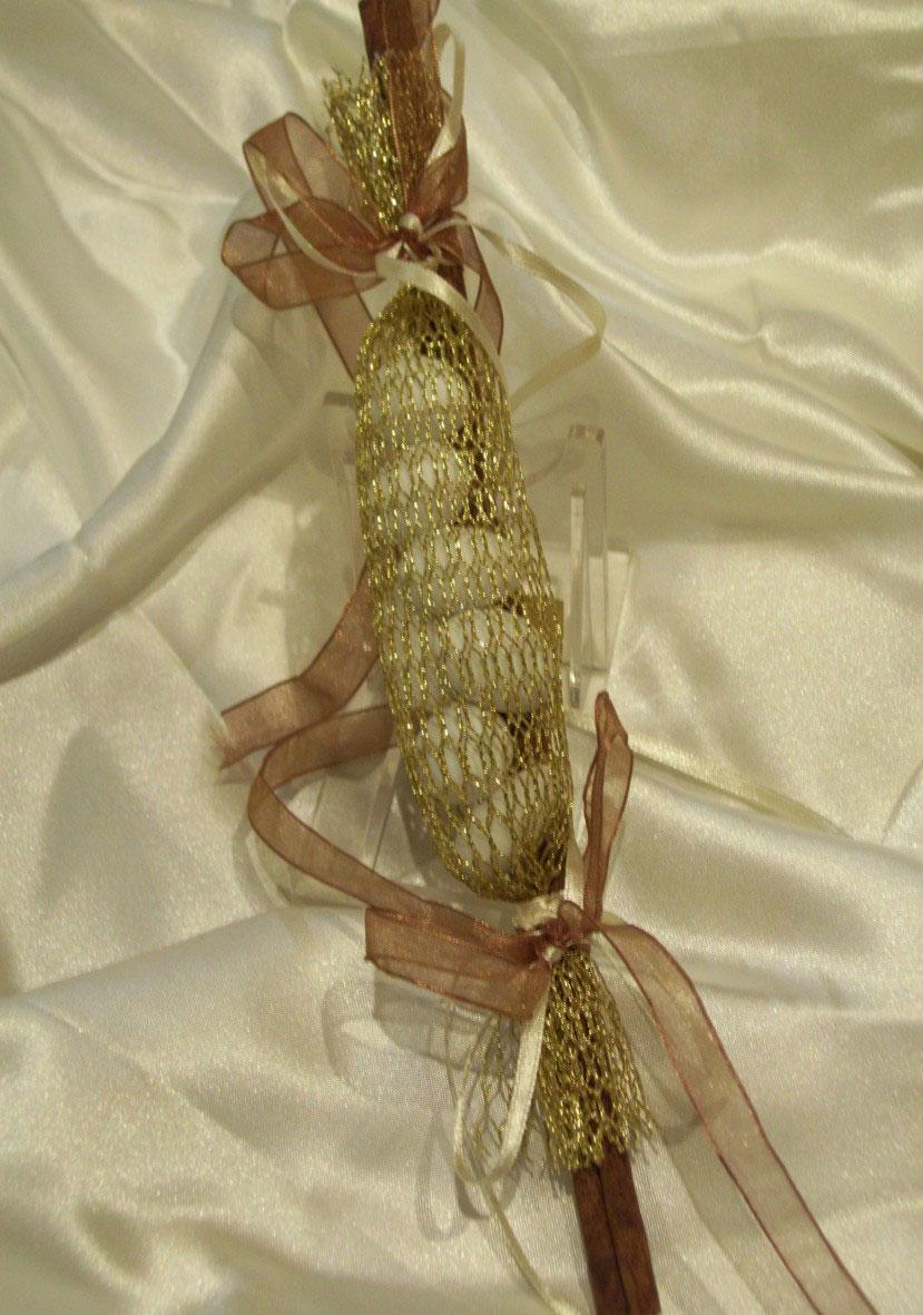 Οικονομική Μπομπονιέρα γάμου πρωτότυπη με κανέλα. Περιλαμβάνει  ένα κλωνάρι κανέλα 25 cm, χρυσό τούλι δίχτυ και 7 κουφέτα.