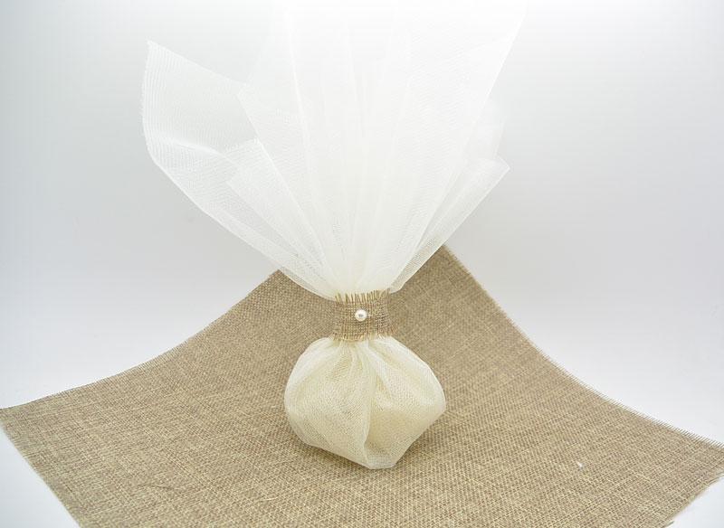 Μπομπονιέρα Γάμου απλή κλασσική με πέρλα. Περιλαμβάνει ύφασμα οργάντζα 40 x 40 cm χρώματος της επιλογής σας και 5 κουφέτα αμυγδάλου.