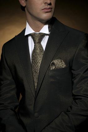 Γαμπριάτικο Κουστούμι με σύνθεση μετάξι και μαλλί. Η βάση του κουστουμιού είναι μαύρη και έχει μεταξωτή χρυσή κλωστή. Υπάρχει και σε μαύρο με μεταξωτή μπλέ κλωστή. Τα κουμπιά είναι επενδυμένα από το ίδιο υφασμα του κουστουμιού.