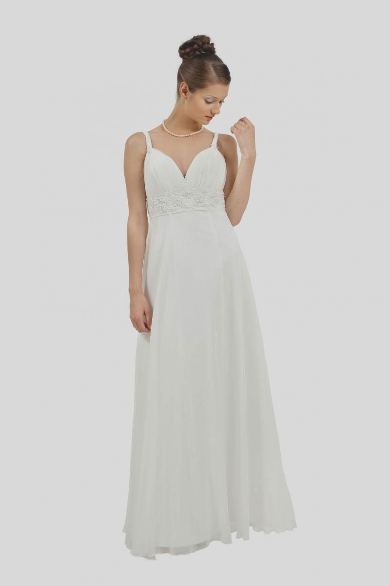 Νυφικό ραμμένο από μεταξωτό σιφόν σε αλφα γραμμή. Στο μπούστο έχει κεντημένη δαντέλα στο χέρι με μικρά κρυσταλλάκια swarovski. Το συγκεκριμενο μοντέλο είναι χωρίς φουρό.