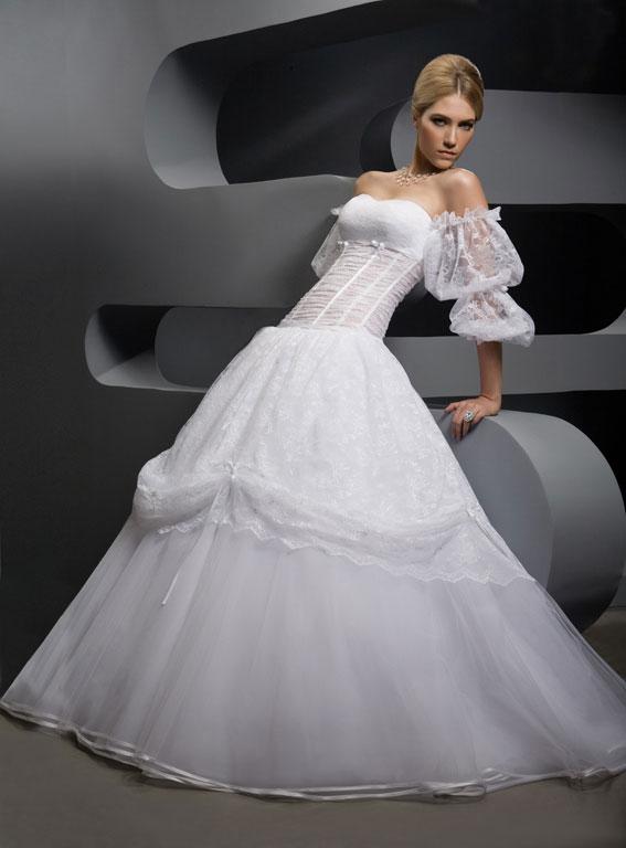 Οικονομικό Ιδιαίτερο νυφικό ραμμένο από μεταξωτό τούλι και δαντέλα σε κλασσική γραμμή. Μπορεί να γίνει σε οποιοδήποτε χρώμα της επιλογής σας. 'Ολα τα νυφικά μας διαθέτουν ενσωματωμένο φουρό.