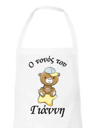 Λευκή ποδιά για το νονό ή τη νονά, εκτυπωμένη με θέμα "Αρκουδάκι". Γράψτε στα σχόλια μέσα στο καλάθι το όνομα του παιδιού σας.