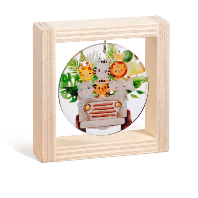 Ξύλινο τετράγωνο καδράκι με στρογγυλή print παράσταση από plexiglass σε διάφανο χρώμα. Η παράσταση απεικονίζει τα ζωάκια της ζούγκλας να πηγαίνουν για safari.