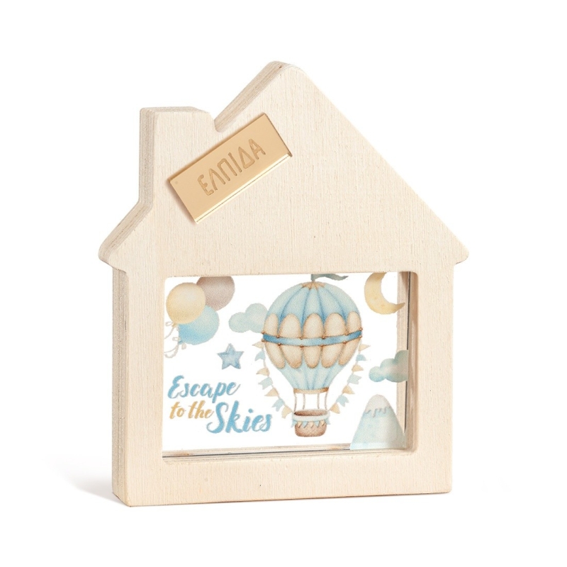 Ξύλινο διακοσμητικό σπιτάκι με καμινάδα και εσοχή σε παραλληλόγραμμο σχήμα. Στο κέντρο είναι διακοσμημένο με παραλληλόγραμμο print plexiglass σε διάφανο χρώμα. Η παράσταση απεικονίζει το σιέλ αερόστατο.